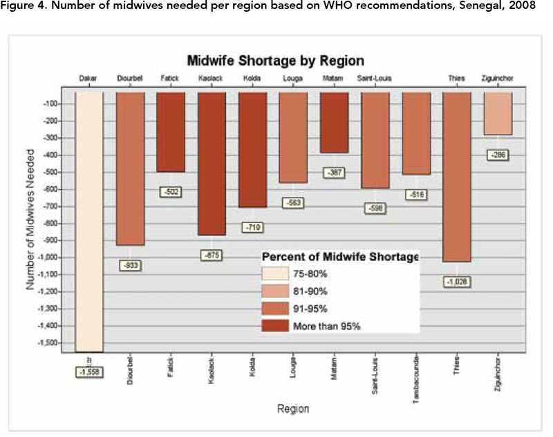 Figure 3 shows regional variations in the shortage of midwives. The four regions of Matam, Fatick, Kaolack and Kolda exhibit the greatest shortage of midwives. Conversely, the region of Dakar has the lowest percent shortage of midwives; however, based on WHO recommendations per population, Dakar has the greatest need in crude number of midwives needed, as shown in Figure 4.