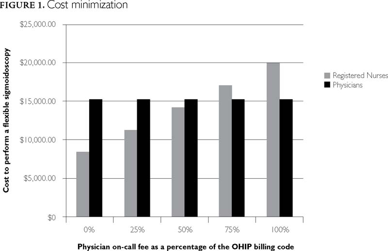 A cost minimization analysis was conducted by comparing the costs of a physician-performed FS with that of a RN-performed FS. The cost of a physician-performed FS was calculated based on the code for flexible sigmoidoscopy in case 1, and included the addition of polyp removal in case 2 (see Table 1). The cost of a RN-performed FS was calculated for each of the five possible physician remuneration scenarios (0%, 25%, 50%, 75% or 100% of the OHIP fee schedule) for case 1 and case 2. A cost minimization analysis was conducted in which we applied cases 1 and 2 in 75% and 25% of all cases, respectively. Therefore, for a population of 100 individuals, it was calculated that 25 average-risk individuals would require intervention from a physician. Thus, 75% of the case 1 cost and 25% of the case 2 cost were combined to provide an overall cost for each on-call fee. The cost of a RN-performed flexible sigmoidoscopy was then compared to the cost of a physician-performed procedure.