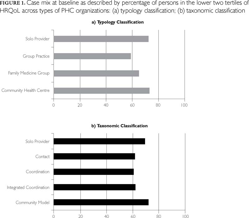 Differences in case mix may explain why we did not find differences in HRQoL outcomes among the various PHC organizational models. Despite the fact that community practices have patients with more complex health problems, their patients' HRQoL was as good as in any of the other models. We did attempt to adjust for case mix by including perceived health status, co-morbidity and use of home care services. Adjusting for case mix is tricky and may be prone to bias, because risks do not remain constant over time (Nicholl 2007). Further, persons with chronic disease who are in need of more comprehensive care may seek this care from certain PHC organizations precisely because of the ability of these organizations to respond to their needs.
