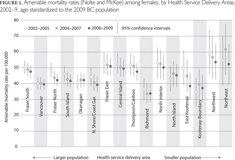 Counts and rates were calculated at the level of Health Service Delivery Area (HSDA), the unit at which national health indicators are reported (CIHI and Statistics Canada 2012). British Columbia's 16 HSDAs are nested in five geographic health regions and had populations ranging from 67,962 (Northeast) to 696,896 (Fraser South) in 2009. Rates were standardized to the 2009 age and sex distribution of the province. We used a binomial distribution to estimate standard error and construct 95% confidence intervals.
