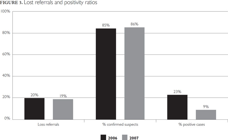 The project was initiated in Ouagadougou and Bobo Dioulasso in 2006. It has so far been limited to a few health districts in these two cities. Figure 2 provides an overview of the number of suspected cases referred and detected.