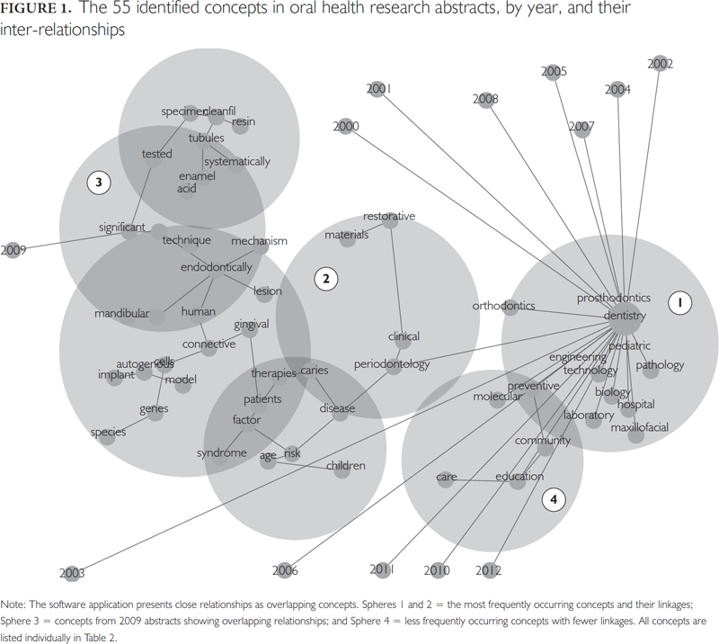 The oral health abstracts were obtained using search terms in the Scopus database as follows: "oral health" OR "dental" OR "dentist" OR "periodontal." The terms were developed in discussion with oral health practitioners to avoid the systematic exclusion of a large corpus of oral health literature. The sample of abstracts was designed to be sufficiently large and the findings sufficiently broad so as not to be substantively different with the addition of more specific words. One difficulty in having too large a sample size is that as the number of found concepts increases, the concept map becomes too detailed, and the manual checks become impractical, yet often the substantive broad findings do not change. The addition of the word "caries," for example, increases the sample size but only by 4%, and separate analysis of that relatively small corpus does not change the findings obtained from the broad sample that includes 15,928 abstracts containing the word "caries" and the chosen search terms.