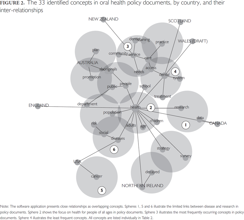 When compared with the concept map of oral health research abstracts in Figure 1, the map in Figure 2 suggests how much more the concept of health, not clinical dentistry concepts, is integral to policy. The more common concepts in the spheres in Figure 2 are concepts about services, care, needs, access, community and training – not clinical concepts. Where the concept of dentist occurs (Sphere #3 in Figure 2), it is proximate to the concept of training. Similarly, where the concept of dental occurs (Sphere #4), it is typically connected with the system concept.