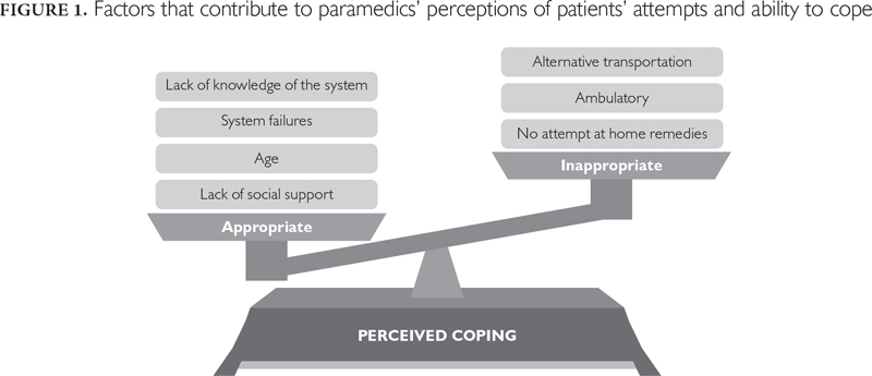 Our findings about paramedics' perceptions of coping complement the few studies that have examined patient and caregiver decision-making when calling for an ambulance. Patients describe their experience of the situation as "intolerable" (Ahl et al. 2006) and cite feelings of anxiety before calling (Ahl et al. 2006; Booker et al. 2013). Booker et al.'s (2013) study of patients who called an ambulance for primary care problems revealed a misunderstanding of options in the healthcare system or previous negative experiences seeking care as factors influencing the decision to call, which is consistent with the cues we found that paramedics use to identify a patient's inability to cope.