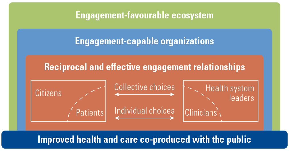 Patient and citizen engagement is taking root in a number of healthcare organizations. These initiatives show promising results but require a supportive environment to bring systemic and sustainable impacts. In this synthesis article, we propose an ecosystemic perspective on engagement in health, outlining key elements at the individual, organizational and systemic levels supporting reciprocal and effective relationships among all partners to provide conditions for the co-production of health and care. We argue that growing a healthy engagement ecosystem requires: (1) building local and national “hubs” to facilitate learning and capacity building across engagement domains, populations and contexts; (2) supporting reciprocal partnerships based on co-leadership; and (3) strengthening capacities for research, evaluation and co-training of all partners to support reflective engagement practices that bring about effective change.
