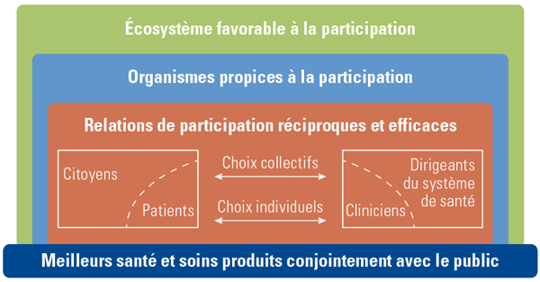 Bien que l’engagement des patient et des citoyens s’implante dans de nombreux organismes de soins de santé canadiens, les équipes de professionnels doivent non seulement comprendre comment leur milieu favorise l’engagement du patient et de ses proches, mais également comment il limite leur capacité à y contribuer véritablement. Un écosystème sain s’impose pour maintenir des relations efficaces entre patients, cliniciens, citoyens et dirigeants du système de santé. Un corpus croissant de données probantes décrit les principales mesures de soutien favorables à l’engagement aux niveaux individuel, organisationnel et systémique. Dans le contexte canadien, les éléments essentiels pour renforcer cet écosystème comprennent : (1) la création de « carrefours » locaux, provinciaux et nationaux qui faciliteront l’apprentissage mutuel et le renforcement des capacités dans tous les domaines, populations et contextes d’engagement; (2) le renforcement de partenariats réciproques fondés sur un leadership partagé (équilibre entre l’engagement « interne » du patient établi par le professionnel et l’engagement « externe » du professionnel établi par le patient et le citoyen); et (3) le renforcement des capacités de recherche, d’évaluation et de formation conjointe chez tous les partenaires afin de soutenir les pratiques d’engagement réflexives en vue d’entraîner un changement véritable. Fondée sur l’idée que les soins de santé sont, à la base, une activité humaine relationnelle, la création d’un écosystème favorable aux partenariats avec le patient et le citoyen est une condition préalable à la coproduction de la santé et des soins de santé.