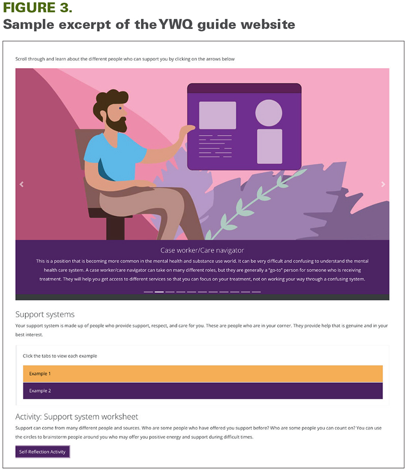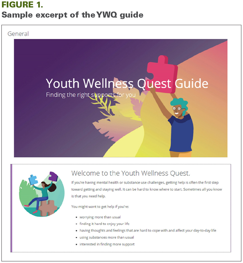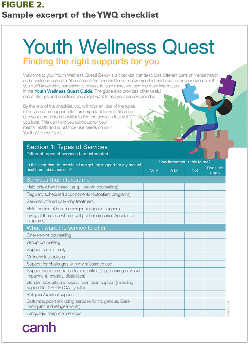 Recognizing the issue noted above, members of the National Youth Action Council (NYAC) at the Centre for Addiction and Mental Health (CAMH) in Toronto, ON, developed the Youth Wellness Quest (YWQ) resource (www.youthwellnessquest.com). NYAC members are Canadian youth with lived experience of mental health and/or substance use difficulties who understand struggles with the mental healthcare system and who used their lived experience to develop YWQ. The YWQ tool is a health literacy and self-advocacy resource for youth seeking services for any type of mental health or substance use concern. It is composed of a guide (Figure 1) and a checklist (Figure 2). The guide helps youth identify the issues most important to them and explains how these may be addressed using youth-friendly language in an engaging, easy-to-navigate format (Figure 3). It lists potential types of services and treatment partners rather than specific treatment providers, guiding youth in how to find such services in their own communities. It suggests questions that youth may ask service providers to be well informed and engaged in the treatment process. Youth may document their needs and preferences on the checklist as part of developing their own treatment plan, potentially alongside their service providers. As the ultimate goal of YWQ is to move youth from the role of patient to partner in their own mental healthcare, the YWQ resource was developed by youth for youth.
