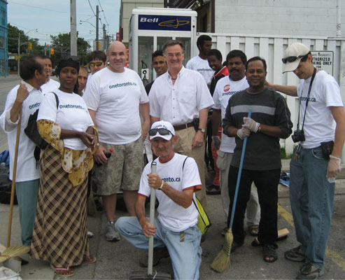 The Honourable George Smitherman and crew take a break from cleaning duties. (Download the photo) We found him in the middle of his riding keeping Toronto clean during its garbage strike. This minister never walks away from a crisis. He is now Minister of Energy and Infrastructure.